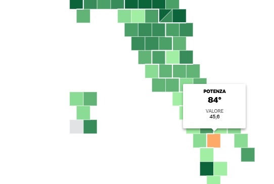 Male Potenza sulla diffusione di impianti pubblici alimentati da fonti energetiche rinnovabili con un dato dichiarato pari a poco più di 2 kw per 1000 abitanti largamente insufficienti e inferiori alla media nazionale (pari a quasi 7 kw per 1000 abitanti). In sostanza a Potenza ci sono non più di 130 kw di potenza energetica pulita installata che alimenta impianti pubblici: davvero pochi. Matera invece non fornisce dati aggiornati. Il numero di alberi (effettivamente presenti nelle aree urbane) della città di Matera è pari a 18 alberi ogni 100 abitanti, uguale al dato dello scorso anno e sotto la media nazionale. Potenza invece dichiara 5 alberi ogni 100 abitanti, uno dei dati più negativi in assoluto in Italia (peggio fanno solo Napoli e Siracusa).