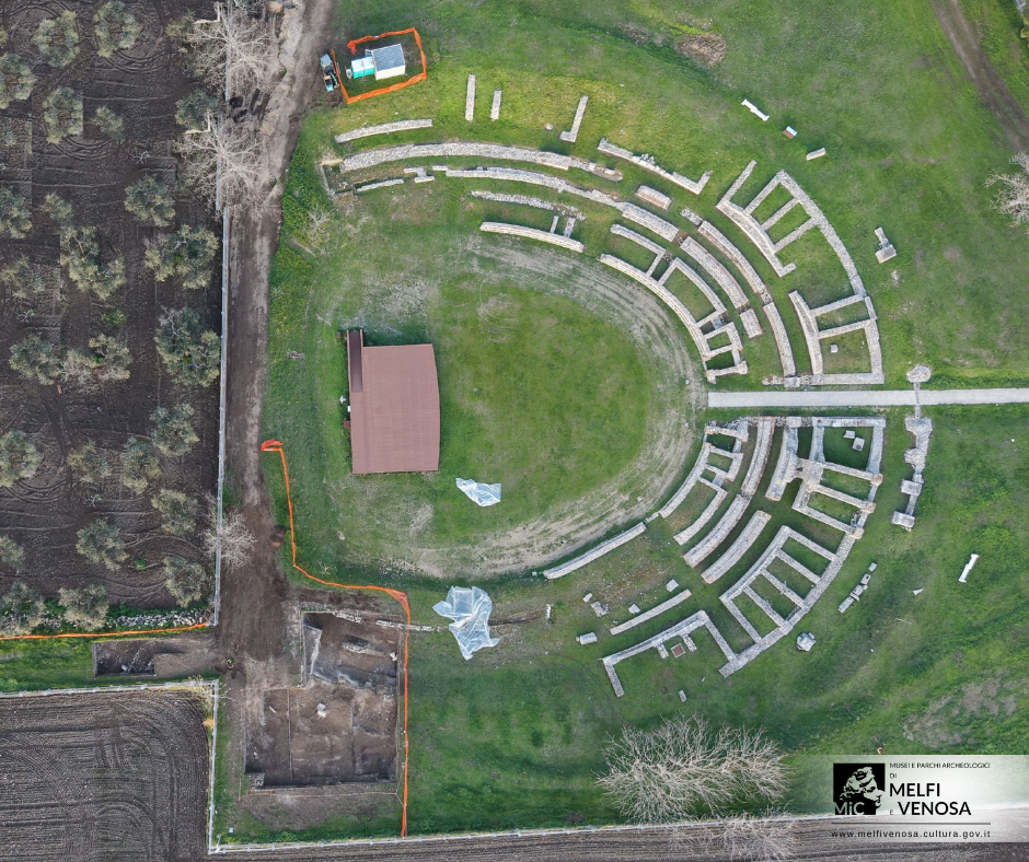 |  Dopo circa quarant’anni dalle ultime indagini sistematiche, sono ripresi gli scavi archeologici presso l’anfiteatro romano del Parco Archeologico di Venosa (PZ), con l’obiettivo di esplorare i settori ancora non indagati del monumento. L’intervento, diretto dai Musei e parchi archeologici di Melfi e Venosa e condotto tra novembre 2025 e febbraio 2026 dal team di archeologi della Culture Vision Srl, è stato finanziato dalla Direzione Generale Musei. “Si apre una nuova stagione di scavi che consentirà di ampliare le conoscenze sull’anfiteatro, espressione dell’urbanitas dell’antica Venusia, con l’obiettivo di restituire l’intero monumento alla fruizione pubblica”, dichiara il Direttore dei Musei e parchi archeologici di Melfi e Venosa, Dott. Tommaso Serafini. L’anfiteatro, situato nel settore nord-occidentale del Parco Archeologico, fu scoperto nel 1841-1842 durante scavi ordinati dal governo borbonico. Dopo un totale abbandono, il sito fu nuovamente oggetto di indagini e restauri nel 1935-1936, in occasione delle celebrazioni del bimillenario della nascita di Orazio, poeta latino originario di Venosa. Nuovi scavi negli anni Ottanta hanno documentato i resti di un quartiere abitativo di età repubblicana distrutto per consentire la costruzione dell’anfiteatro nel I secolo d.C. Ulteriori interventi di restauro e valorizzazione hanno coinvolto il monumento negli anni 2006-2007 e 2022-2023, con l’avvio di ricerche da parte dell’Università degli Studi della Tuscia a partire dal 2023. Di forma ellittica e con un’estensione di circa 7.600 mq, l’edificio fu realizzato sfruttando in parte il pendio naturale e in parte un terrapieno artificiale. Il materiale ceramico recuperato negli strati di distruzione e livellamento suggerisce una data di fondazione nel corso dell’età giulio-claudia, tra fine I sec. a.C. e prima metà I sec. d.C. L’anfiteatro risulta composto da un anello esterno in pilastri di grandi blocchi e un corpo centrale, costituito da corridoi anulari e cunei radiali sostenenti le gradinate, in opus reticulatum con successivi rinforzi in opus mixtum. Poiché la porzione di anfiteatro oggi visibile è frutto di sterri e rifacimenti tra Ottocento e primo Novecento, le nuove indagini consentono di recuperare dati attualmente perduti, chiarendo le modalità costruttive, le trasformazioni dell’edificio e il rapporto tra le strutture e il pendio naturale, per offrire una lettura aggiornata del monumento.