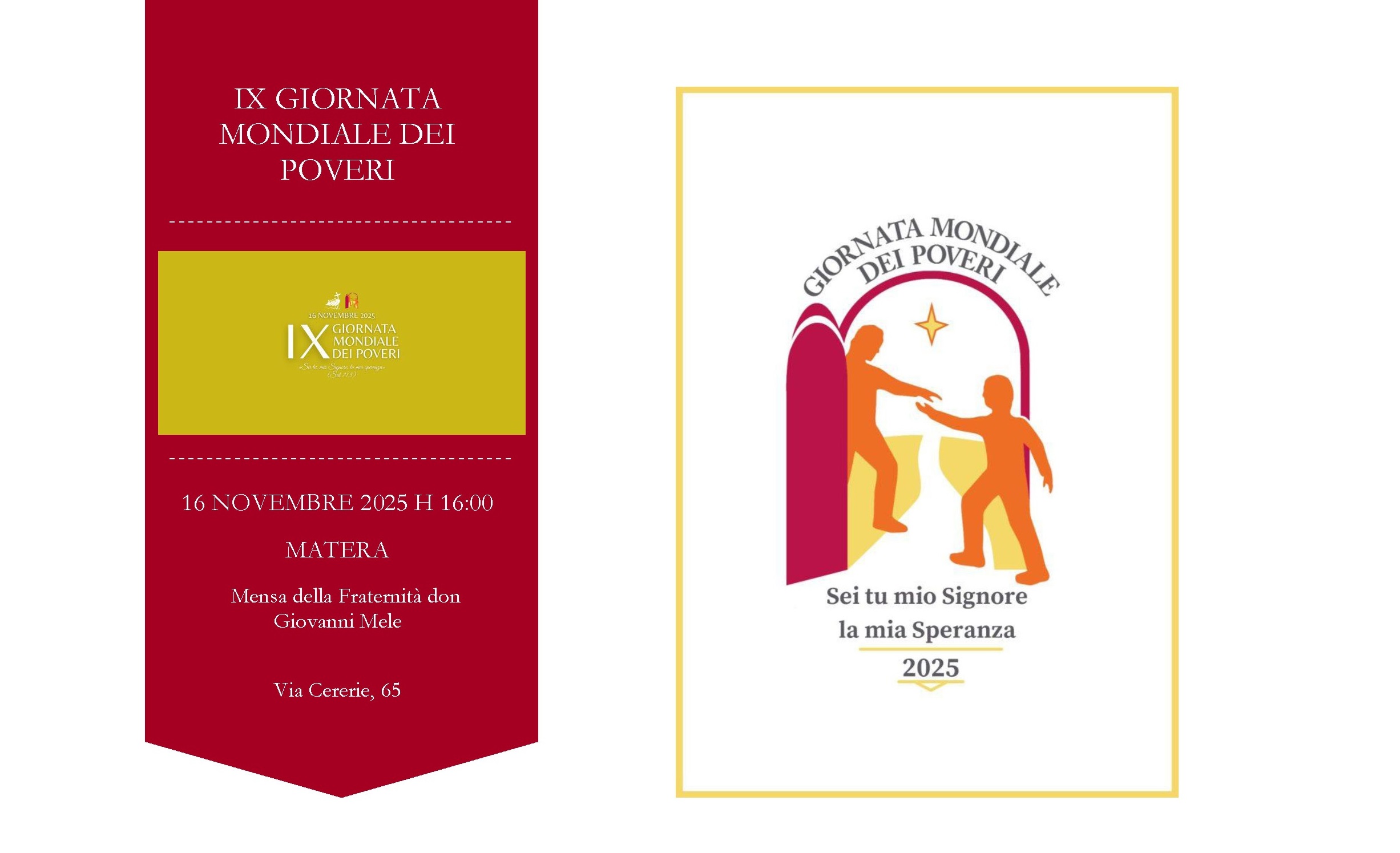 Il 16 novembre alle ore 16:00 nella sede della Mensa della Fraternità don Giovanni Mele, in Via Cererie, 65 a Matera, in occasione della IX Giornata Mondiale dei Poveri istituita da Papa Francesco, la Caritas diocesana di Matera-Irsina presenterà l’evento