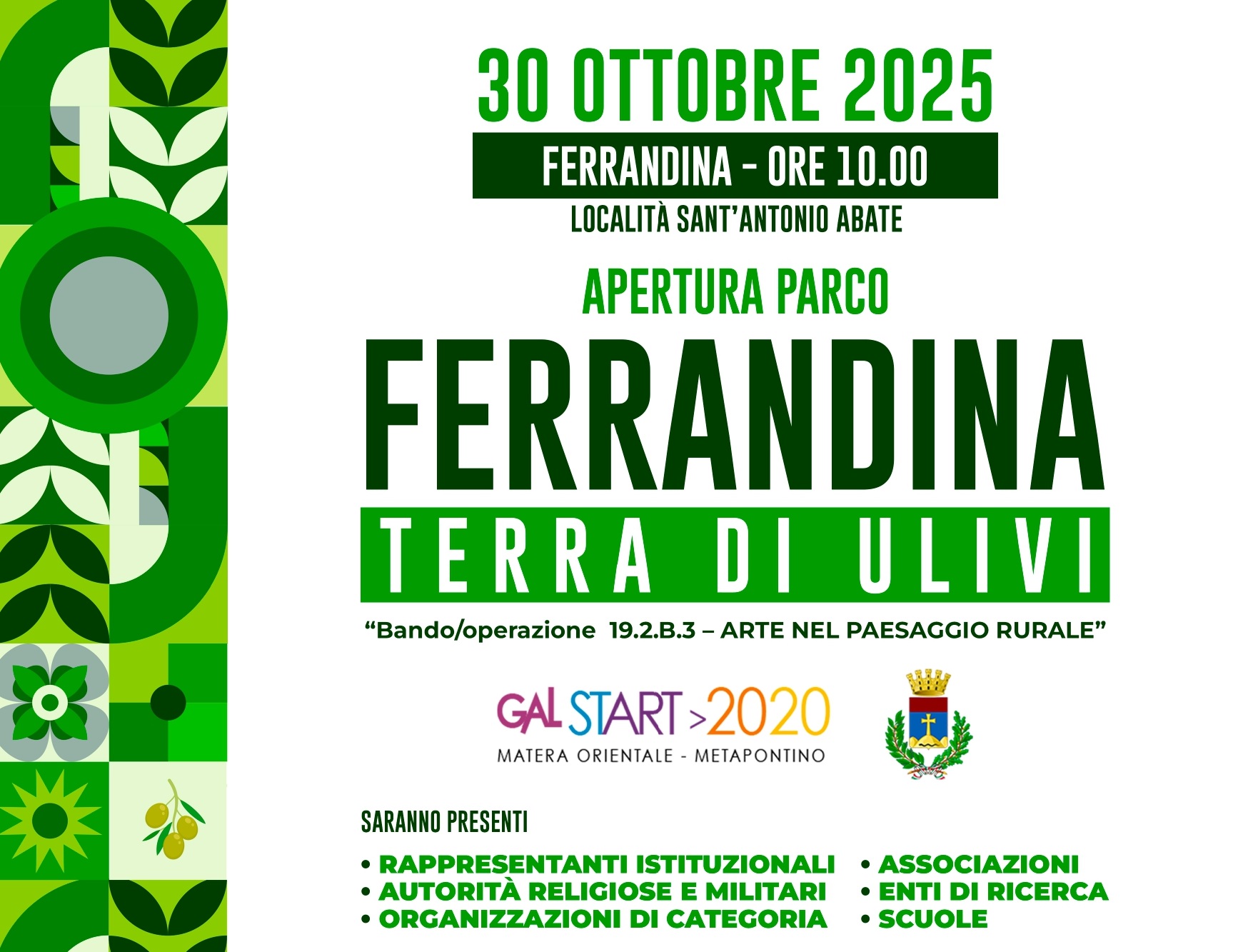 Si inaugura giovedì 30 ottobre, alle ore 10, l’area attrezzata in località Sant’Antonio Abate, cuore pulsante del progetto “Ferrandina terra degli ulivi”, finanziato nell’ambito della misura 19.2.B.3 "Arte nel Paesaggio Rurale" del GAL START 2020.