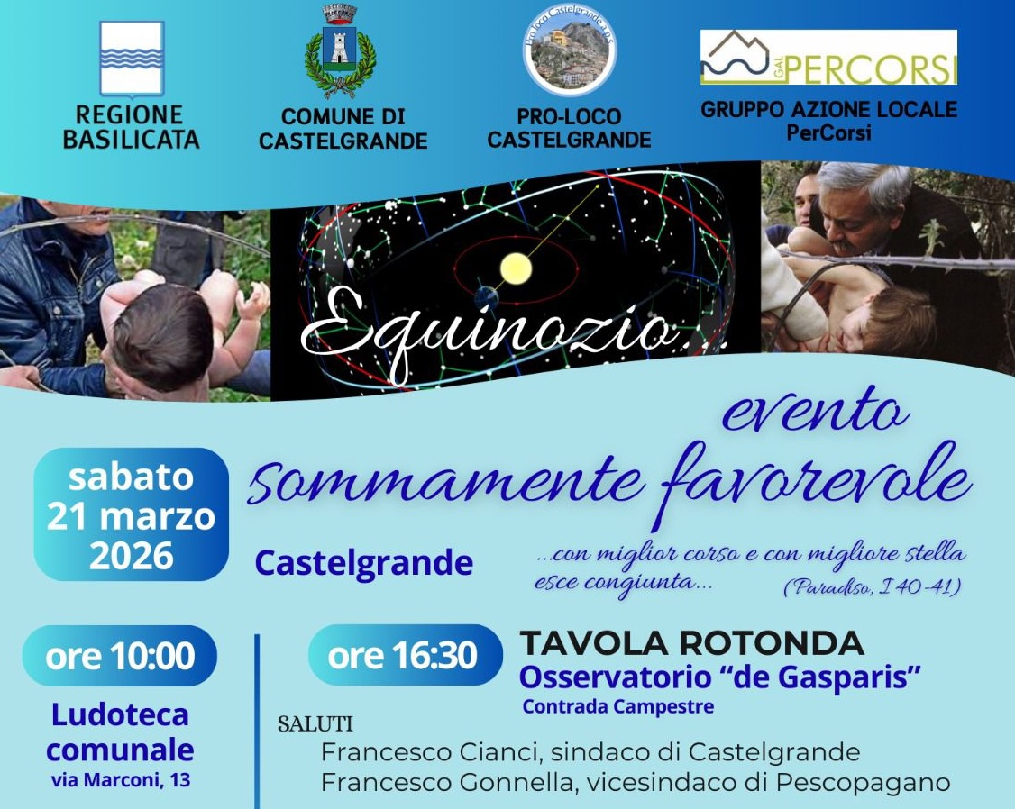 Sabato 21 marzo 2026, a partire dalle ore 10:00 e per l’intera giornata, Castelgrande ospiterà “Equinozio… evento sommamente favorevole”, iniziativa dedicata all’astronomia culturale e alla valorizzazione delle tradizioni locali. L’evento, patrocinato da Regio...-->continua |