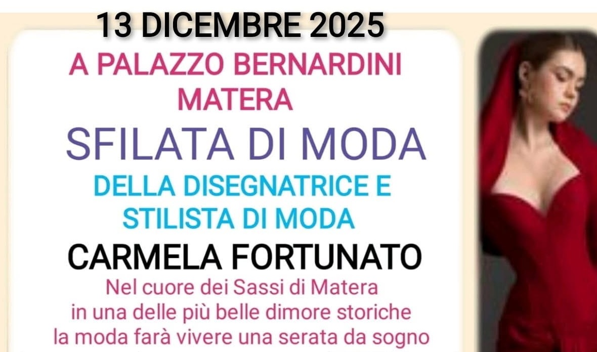 Il 13 dicembre 2025, nella cornice di Palazzo Bernardini, storica dimora settecentesca incastonata nei Sassi di Matera, andrà in scena una serata dedicata alla moda e all’espressione artistica. Il celebre salone delle feste, impreziosito da affreschi barocchi ...-->continua