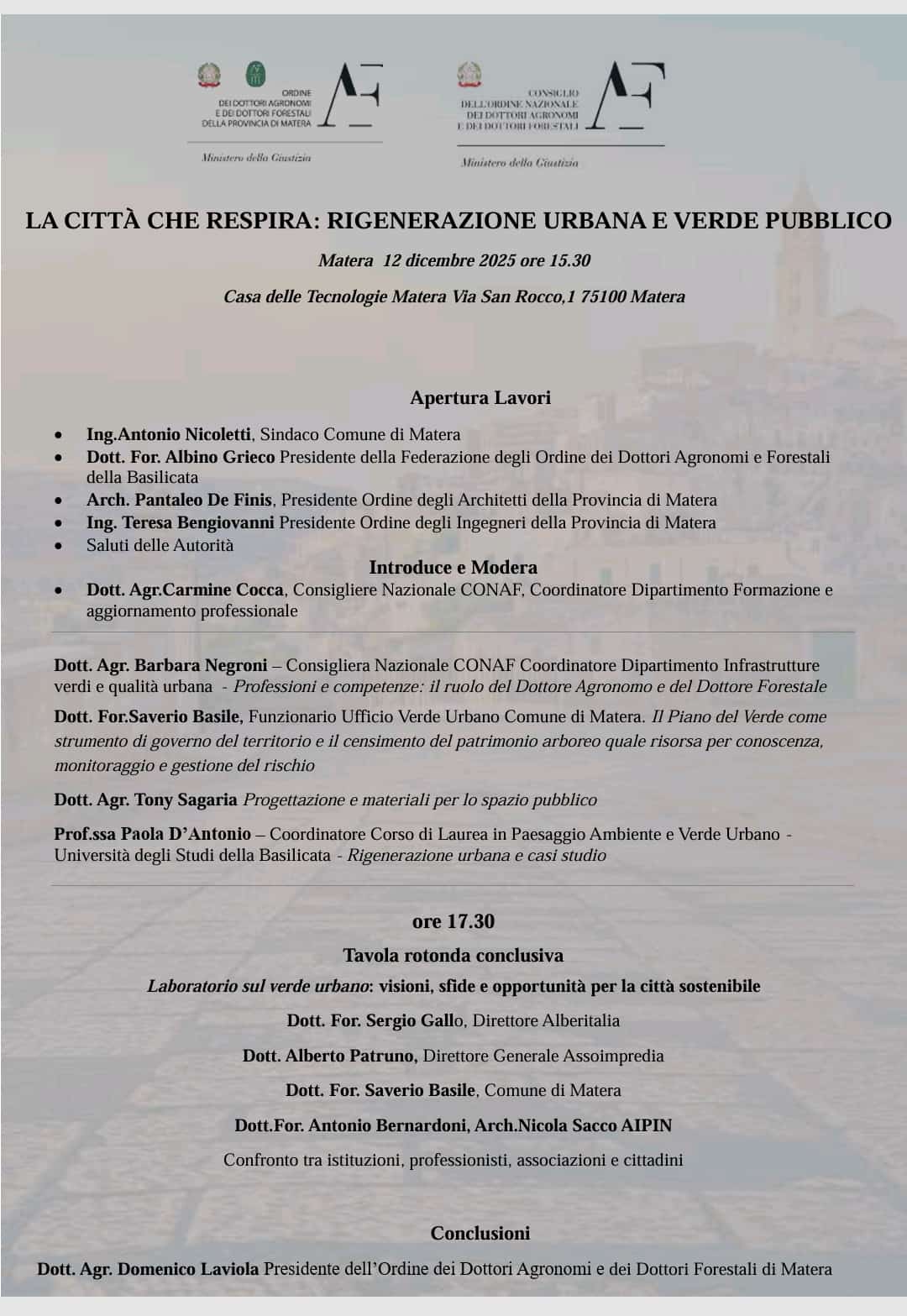 “Oggi venerdi 12 dicembre 2025 dalle ore 15,30 nella Casa delle Tecnologie Matera in Via San Rocco, 1 a Matera si svolgerà il convegno sul tema “La città che respira: rigenerazione urbana e verde pubblico”, -dichiara il Presidente dell’Ordine Domenico Laviola - organizzato d...-->continua |