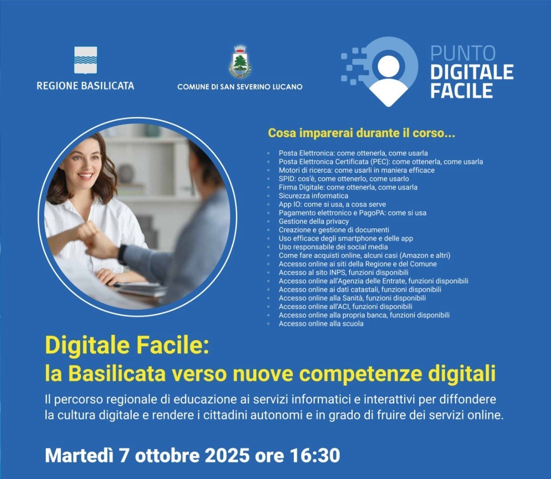 11/10/2025 | Lo scorso 7 Ottobre nel pomeriggio, presso la Sala Consiliare “Rosario La Sala” del Municipio di S. Severino Lucano, è stato illustrato l’insieme di moduli gratuiti del progetto: “Digitale Facile,” organizzati dalla Regione Basilicata, Direzione Generale dell’Amministrazione Digitale, che già lo scorso anno era presente nei Comuni, con un primo approfondimento dei temi del Digitale che serviva come introduzione per questo secondo seminario formativo. Il corso che partirà quest’anno, come in passato, sarà presente in diversi Comuni della Basilicata, e condotto dai facilitatori digitali. Per S. Severino Lucano, riconfermato l’ incarico, all’Ing. Alfonso Manago’, che è originario proprio del piccolo paese. Le lezioni prenderanno il via per il piccolo centro, Martedì 21 Ottobre alle 17:00, presso la Sala Consiliare del Municipio, mentre dalle 16:00 alle 17:00 nella stessa aula, sarà attivo lo Sportello che darà supporto a tutti i cittadini nelle attività legate all’attivazione gratuita ed all’utilizzo dei servizi pubblici online (SPID, CIE, INAD domicilio digitale, e-government, servizi sanitari, servizi scolastici e formativi).