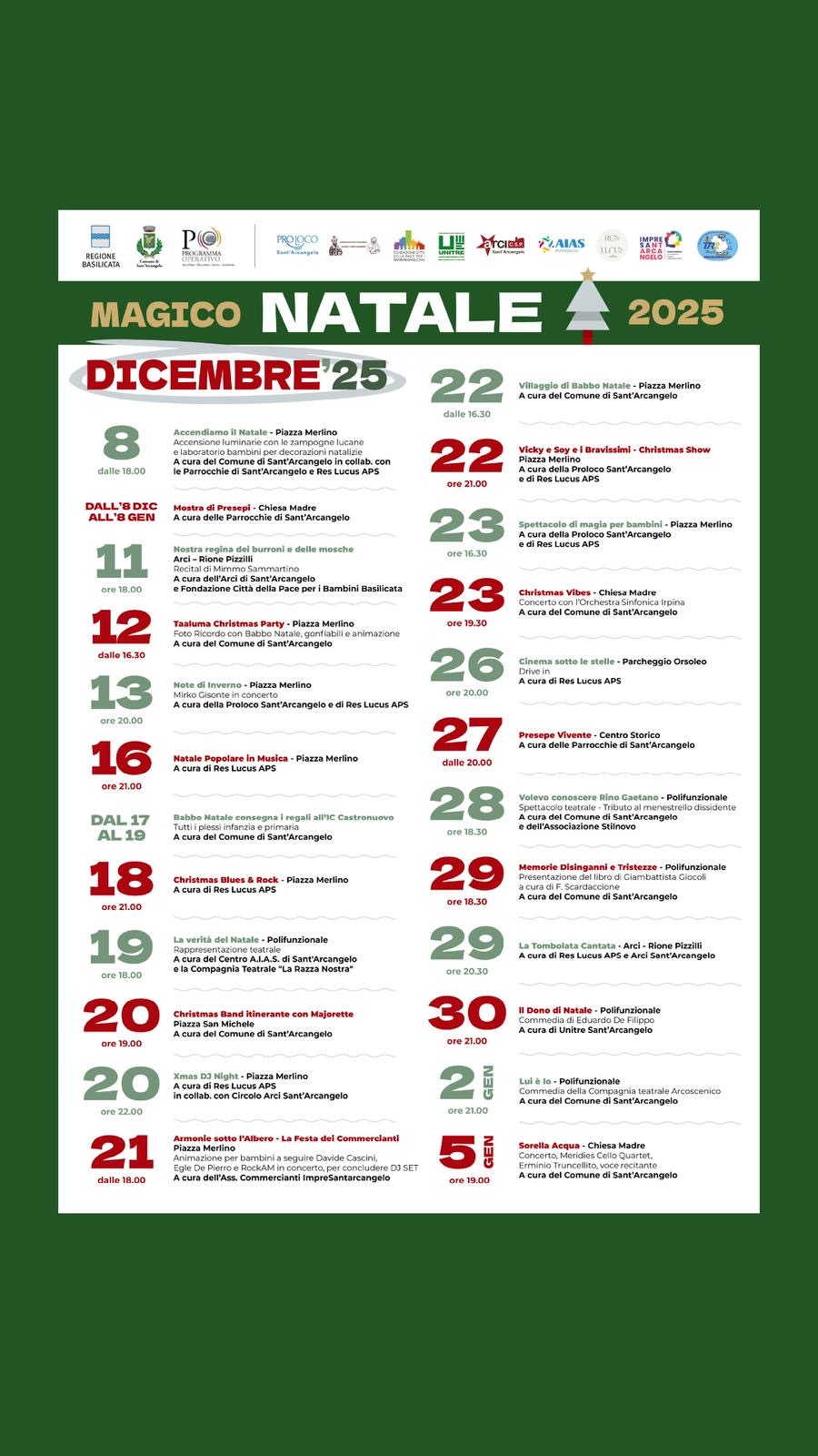29/11/2025 | L’amministrazione di Sant'Arcangelo ha pubblicato ufficialmente il calendario degli eventi natalizi. Si parte l’8 dicembre, alle ore 18.00 con le accensione delle luminarie in Piazza Merlino (San Brancato) accompagnate dalle note delle zampogne lucane ed un laboratorio per bambini/e dedicato alle decorazioni natalizie per poi proseguire fino ad un concerto che si terrà presso la chiesa la madre il 5 gennaio. Tra gli eventi che variano, dal concerto di Mirko Gisonte, il teatro sotto le stelle, il presepe vivente e così via, si prospetta un mese all'insegna della condivisione e del divertimento.