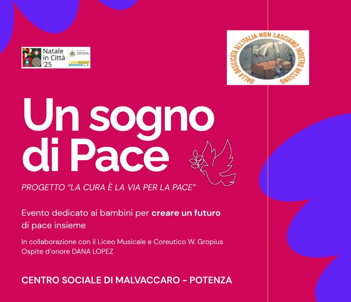 L’associazione “Dalla Basilicata all’Italia – non lasciamo indietro nessuno” presenta l’evento Un sogno di pace, inserito nel cartellone Natale in città promosso dal Comune di Potenza. L’iniziativa si svolge nell’ambito del progetto “La cura è la via per la pace”, con l’obie...-->continua |