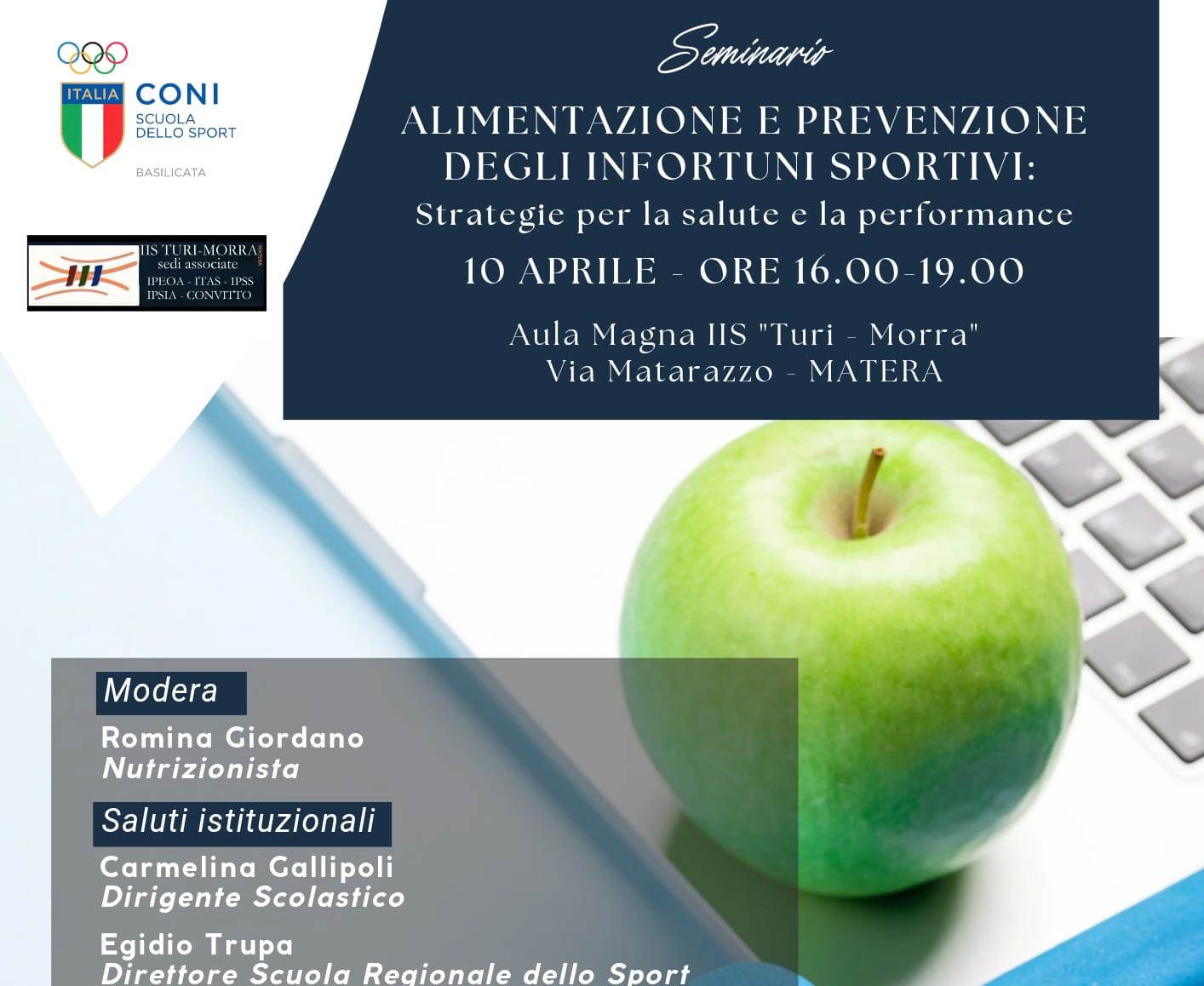 E' in programma per venerdì 10 aprile, dalle 16 alle 19, presso l'aula magna dell'SS "Turi-Morra" di Matera, il Seminario "Alimentazione e prevenzione degli infortuni sportivi: strategia per la salute e la performance".