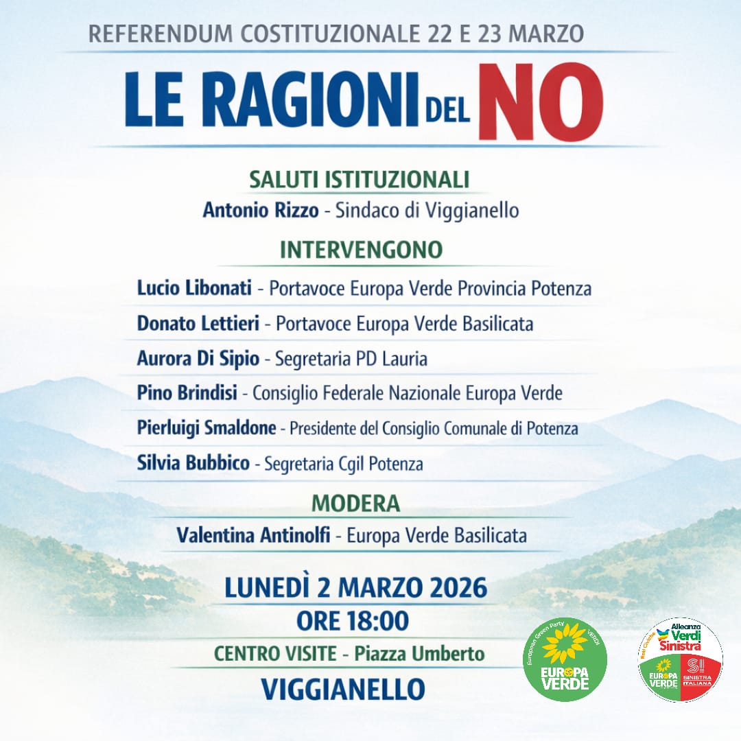 Europa Verde–AVS Basilicata promuove per lunedì 2 marzo, alle ore 18.00, presso il Centro Visite di Piazza Umberto a Viggianello, l’iniziativa pubblica “Le ragioni del No” in vista del referendum costituzionale del 22 e 23 marzo sulla riforma dell’ordinamento giudiziario.
