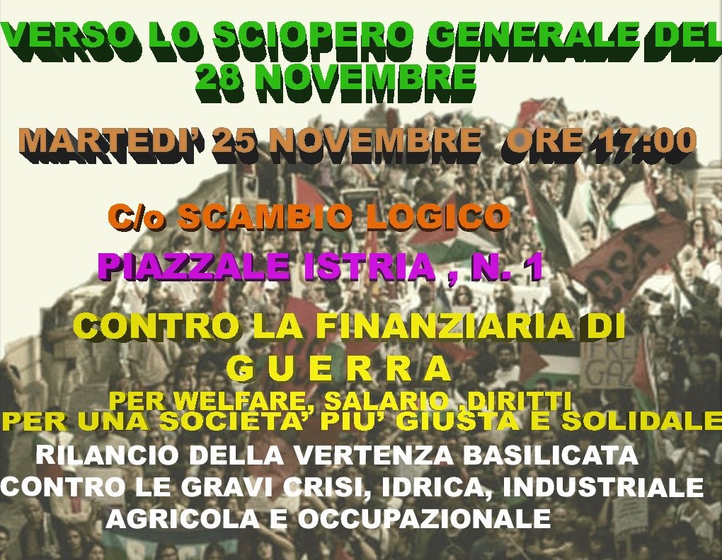 In previsione dello Sciopero Generale del 28 Novembre proclamato dalla USB è indetta una Pubblica Assemblea alle ore 17:00 di Martedì 25 Novembre presso Scambio Logico a Potenza, in piazzale Istria, 1 :