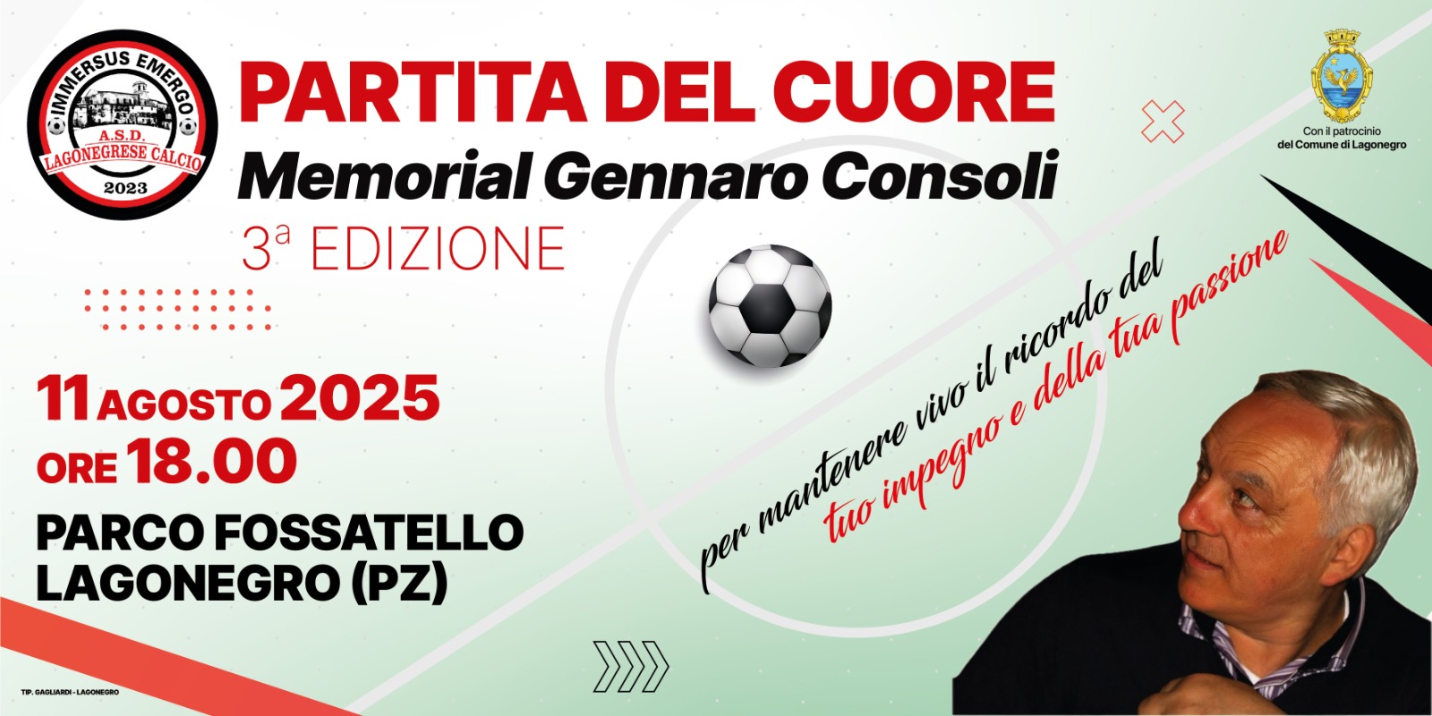 | Torna anche quest’anno uno degli appuntamenti più sentiti dell’estate sportiva lagonegrese: il Memorial Gennaro Consoli, giunto alla sua terza edizione consecutiva. La manifestazione, organizzata dall’ASD Lagonegrese Calcio, si terrà lunedì 11 agosto 2025 a partire dalle ore 18.00 presso il Parco Fossatello, nell’ambito del calendario di eventi dell’Estate Lagonegrese 2025.