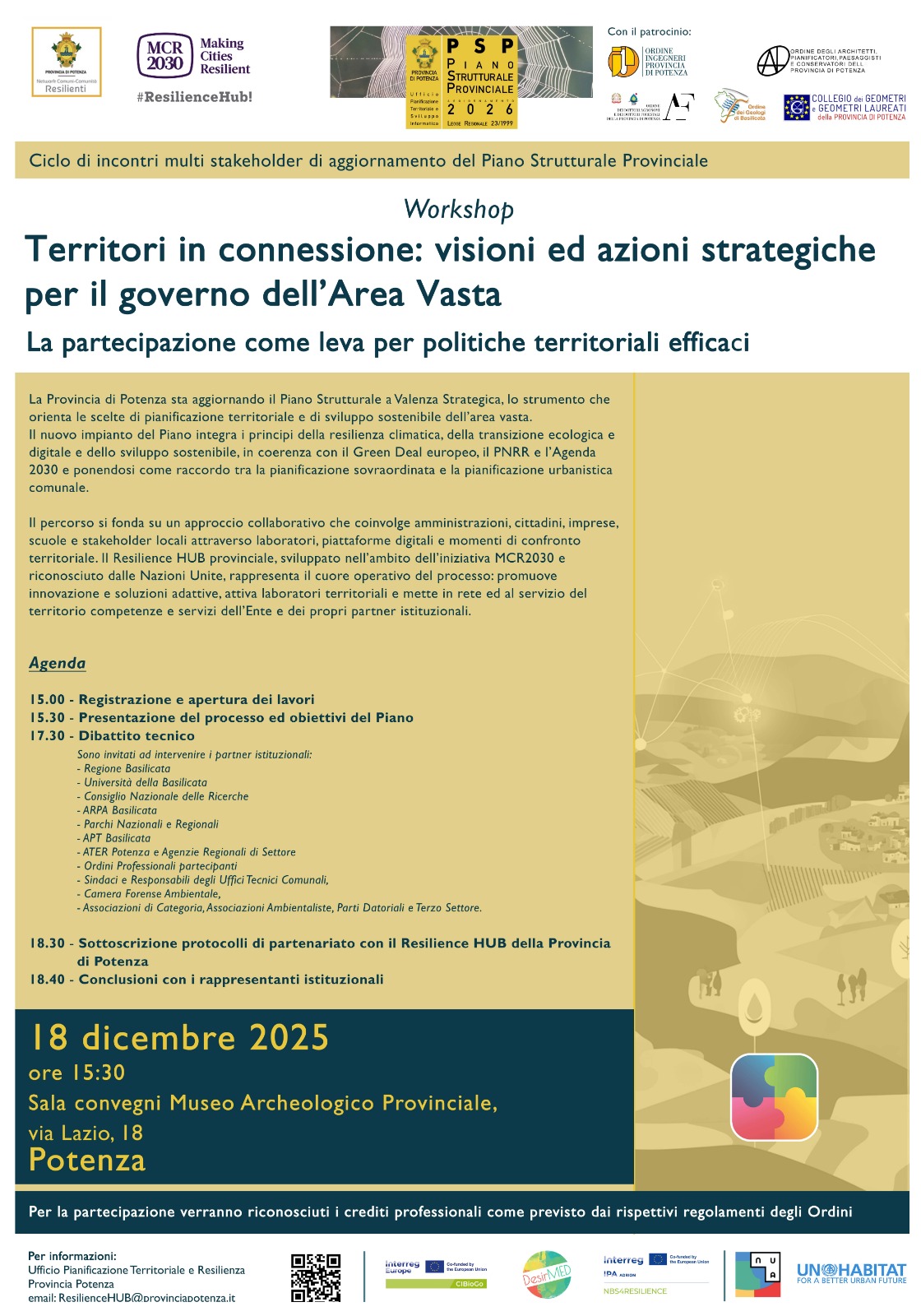 | | "La Provincia di Potenza organizza giovedì 18 dicembre 2025 il workshop “Territori in connessione: visioni e azioni strategiche per l’Area Vasta”, presso il Museo Provinciale. Al centro dell’incontro resilienza climatica, transizione ecologica e digitale, sviluppo sostenibile e il Resilience HUB provinciale. Previsti momenti di confronto con istituzioni, esperti e stampa e la sottoscrizione di protocolli di partenariato per rafforzare coesione e innovazione territoriale." |