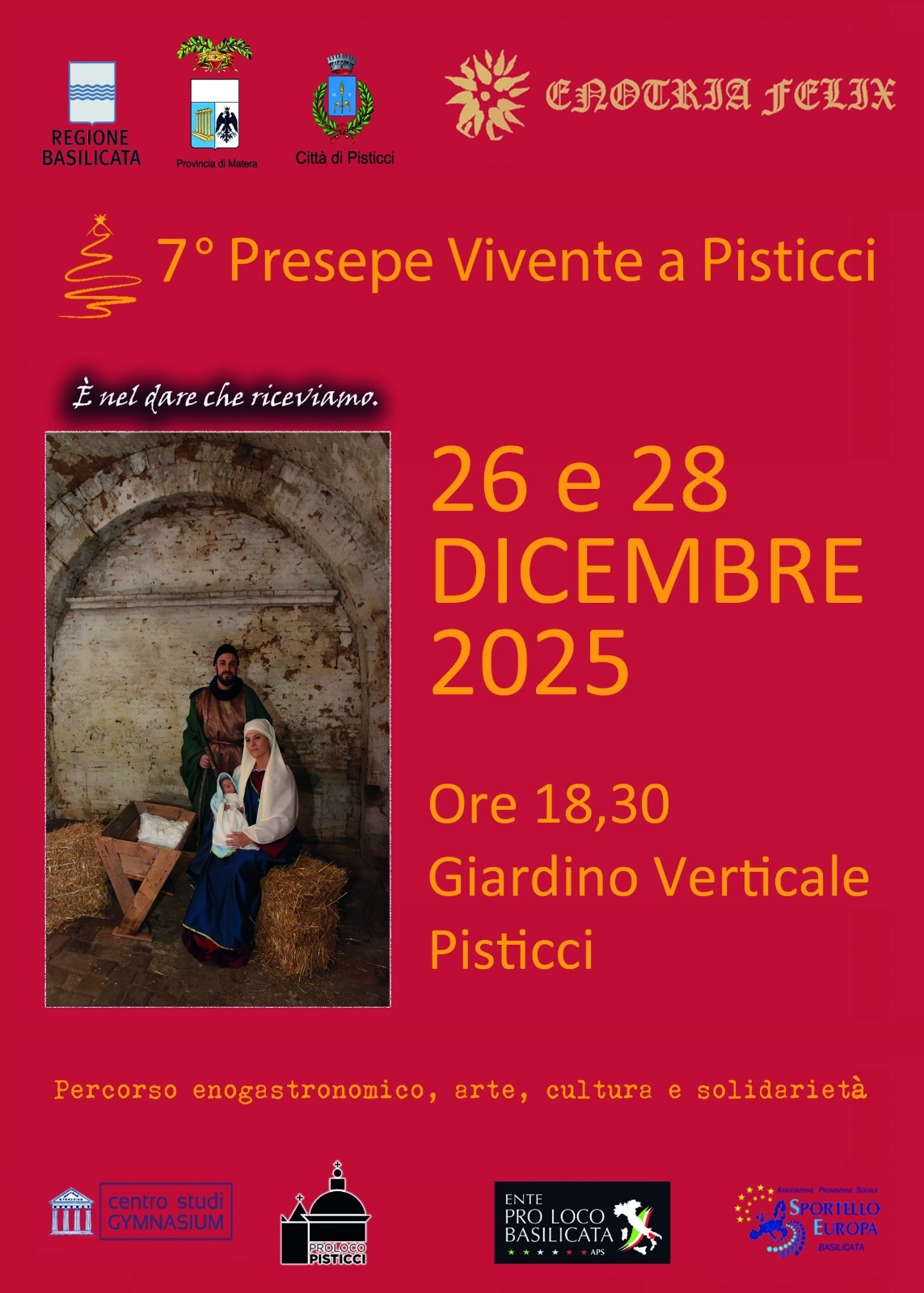 | | "Il 26 e 28 dicembre il Giardino Verticale di Pisticci ospita il Presepe Vivente, con scene, figuranti e sapori della tradizione natalizia. Evento gratuito, tra storia, luci e degustazioni tipiche, promosso da Enotria Felix con il supporto di Comune e associazioni locali." |