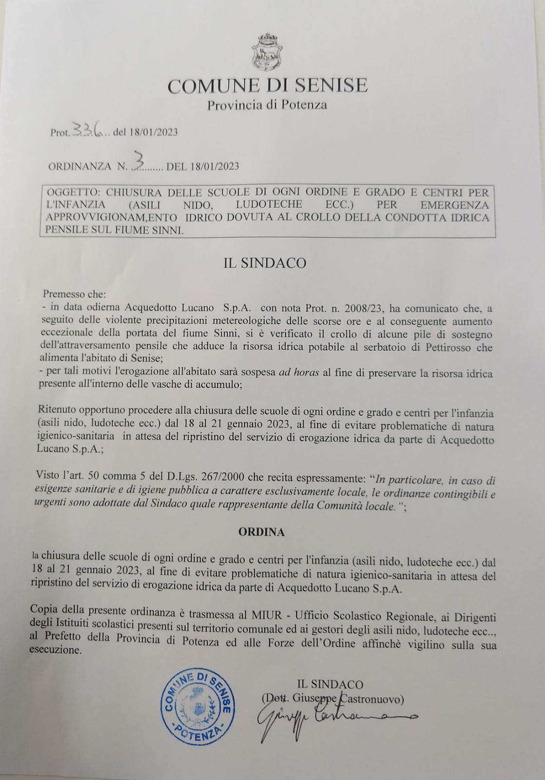 “Ovviamente il danno è troppo ingente per pensare ad una rapida riparazione - prosegue Castronuovo - in quanto sono crollati i piloni di sostegno. Tuttavia, chiederò se nel frattempo si possano adottare soluzioni alternative alle sole autocisterne. Penso, ad esempio, se si possa sfruttare la condotta che da San Giorgio fornisce alcune nostre aree rurali. Sono ipotesi che sto facendo io adesso e circa le quali mi dovrò confrontare con i tecnici e in giornata saprò essere più preciso. Oggi le scuole sono rimaste aperte, ma dopo l’incontro valuterò se chiuderle o meno”.