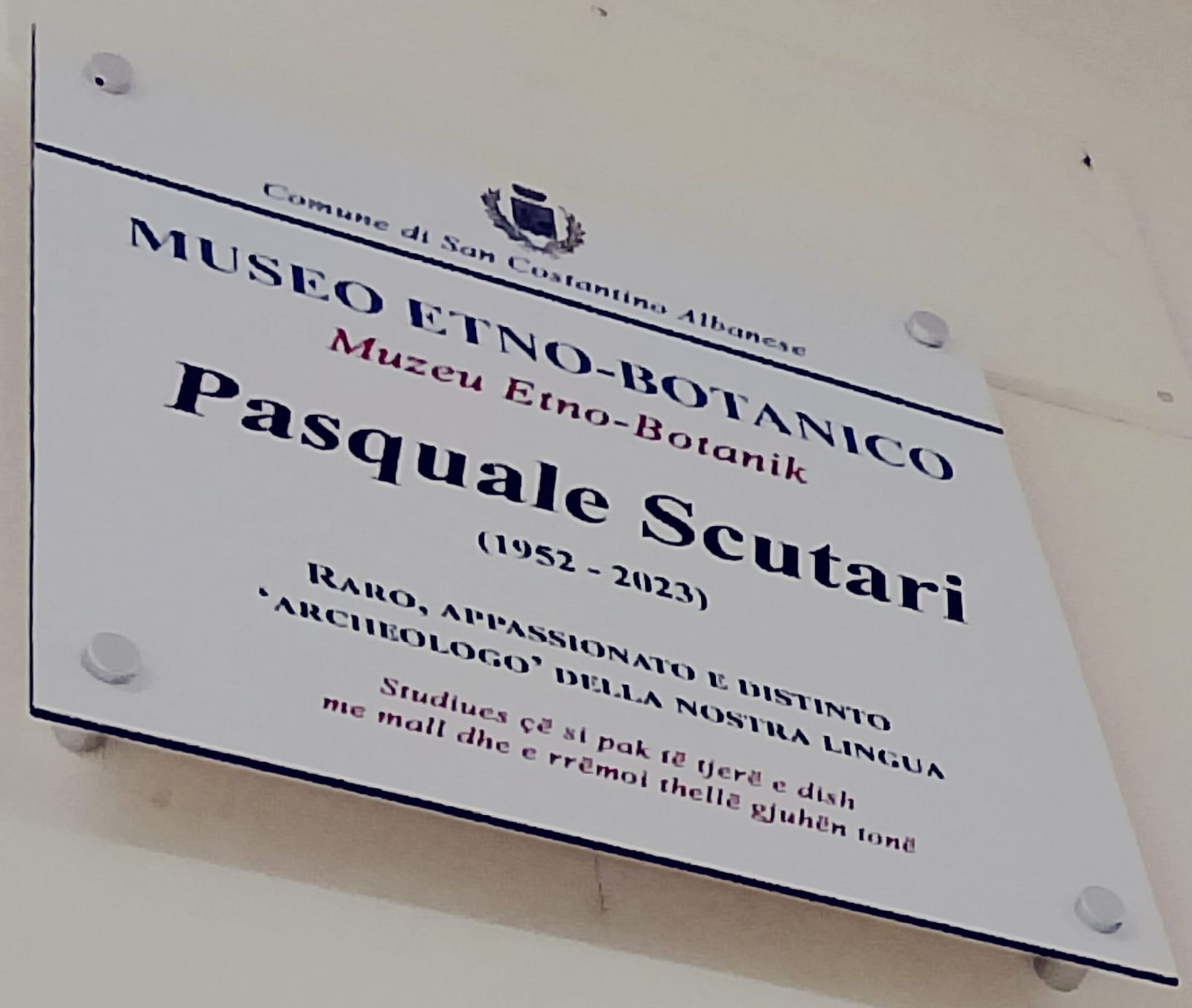 Tutti gli intervenuti hanno ricordato il Professor Pasquale Scutari e i suoi numerosi studi sulla parlata di San Costantino Albanese, i quali hanno tracciato un solco importante per gli studi successivi, come nel caso delle ricerche sul lessico fitonimico. A lui si deve infatti il primo dizionario botanico arbëresh. Il Professor Altimari, a conclusione del convegno, ha ricordato il Professor Scutari e la metodicità applicata nei suoi lavori nonché i momenti condivisi durante i periodi di ricerca. Sulla targa commemorativa si legge: " Museo etnobotanico Pasquale Scutari (1952-2023). Raro, appassionato e distinto archeologo della nostra lingua. Studiues cë si pak të tjerë e dish me mall che e rrëmoi thellë gjuhën tonë". |