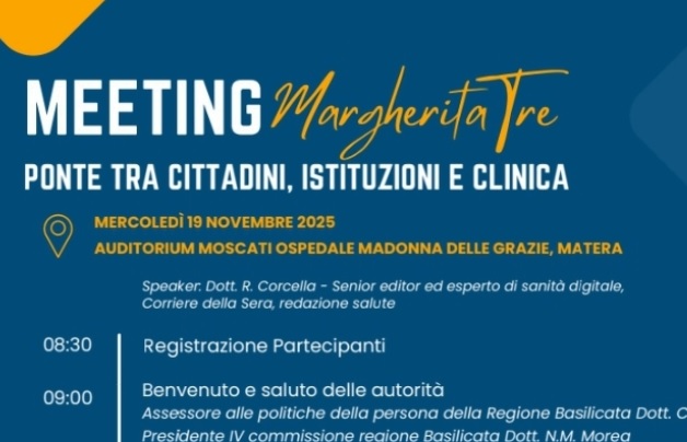 La sanità lucana ospita un appuntamento di rilievo nazionale: il Meeting “MargheritaTre – Ponte tra cittadini, istituzioni e clinica”, in programma mercoledì 19 novembre 2025 all’Auditorium Moscati dell’Ospedale Madonna delle Grazie di Matera.