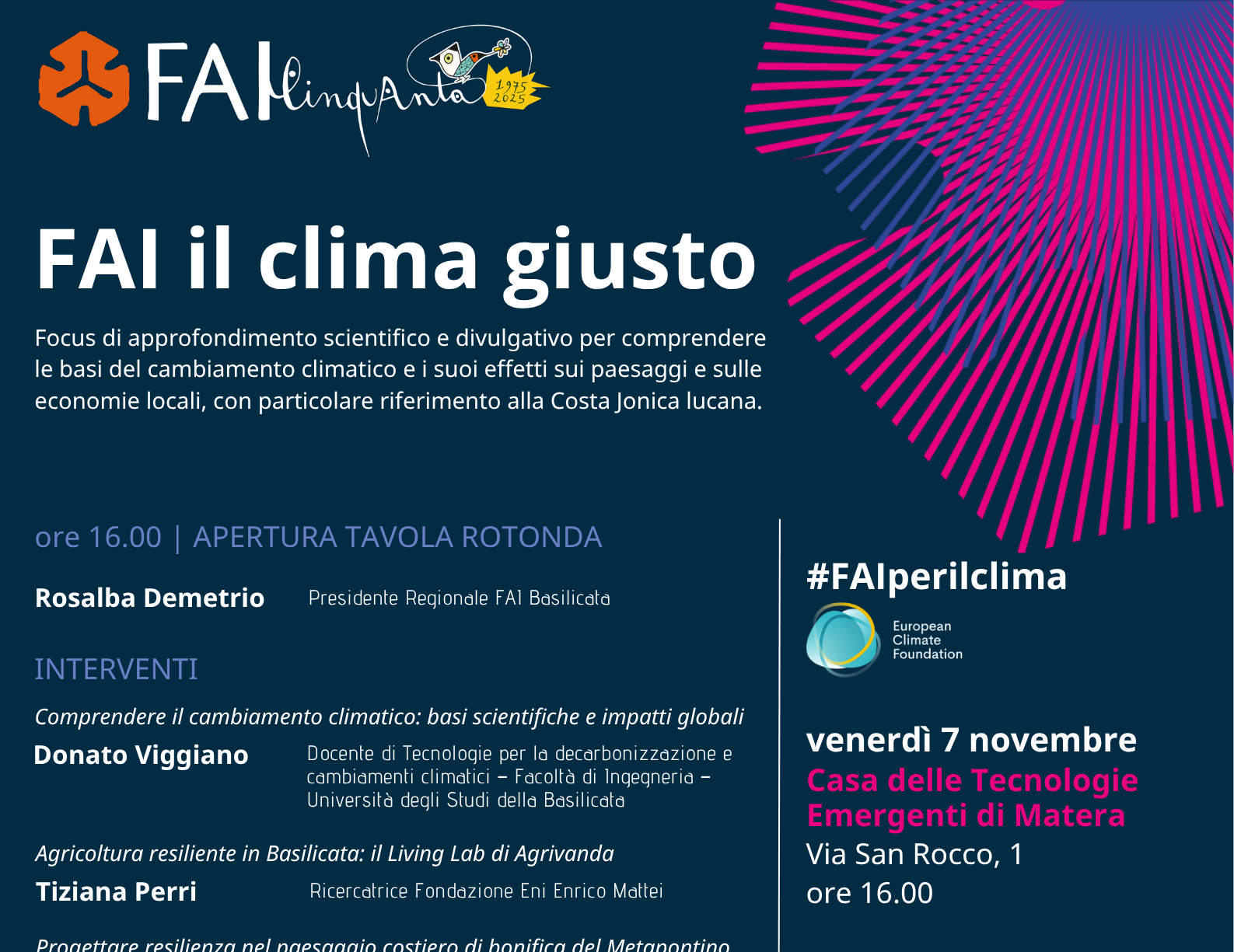 Il 7 e 8 novembre 2025, il FAI Basilicata promuove due giornate dedicate al clima e alla sostenibilità, con l’obiettivo di diffondere consapevolezza e partecipazione sui temi del cambiamento climatico, valorizzando i paesaggi lucani come veri e propri laborato...-->continua |