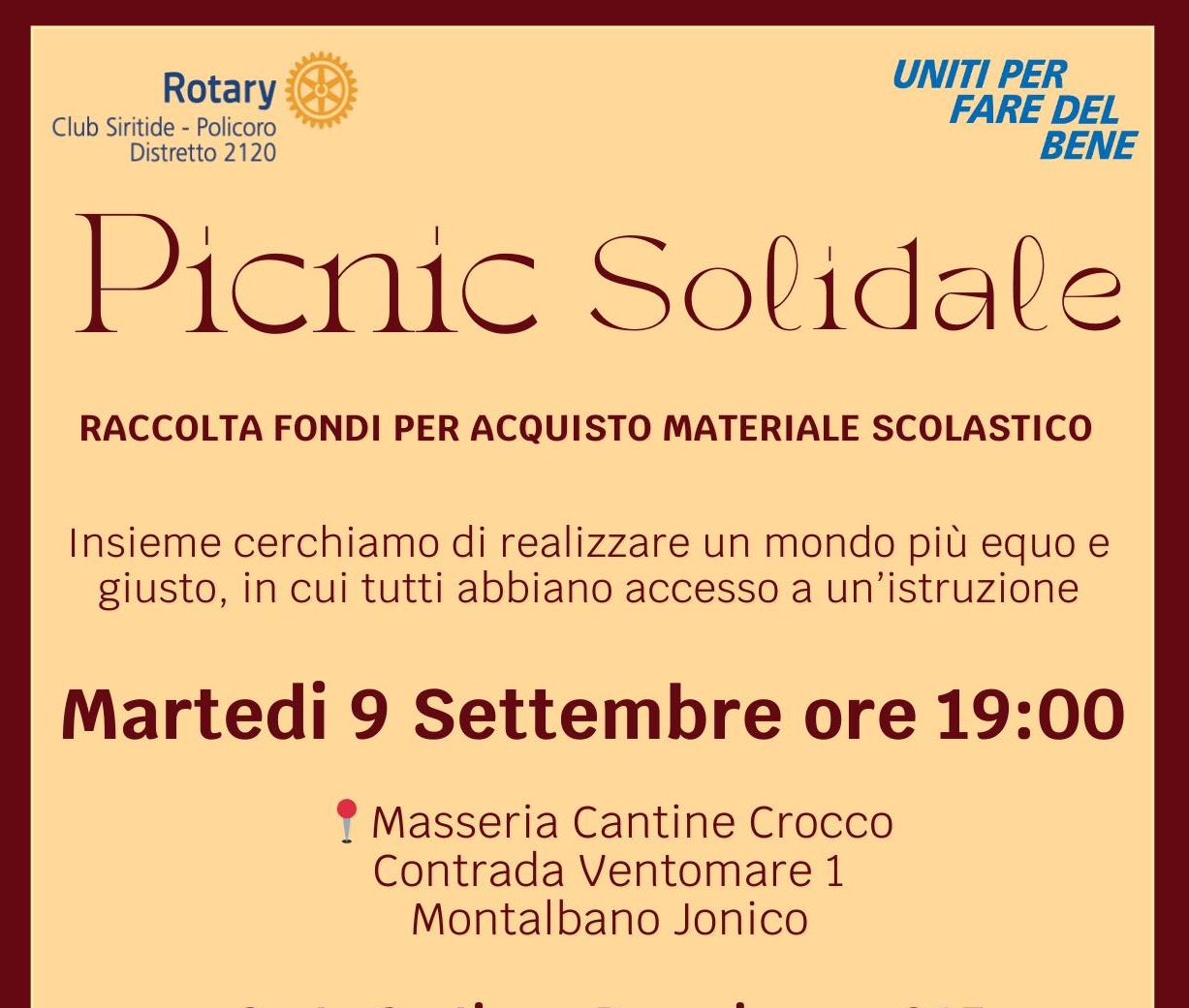 Proprio in questo spirito, il Rotary Club Siritide – Policoro organizza il “Picnic Solidale”, un evento di beneficenza che si terrà il 9 settembre alle ore 19:00, presso la Masseria Cantine Crocco, in via Ventomare 1 a Montalbano Jonico.