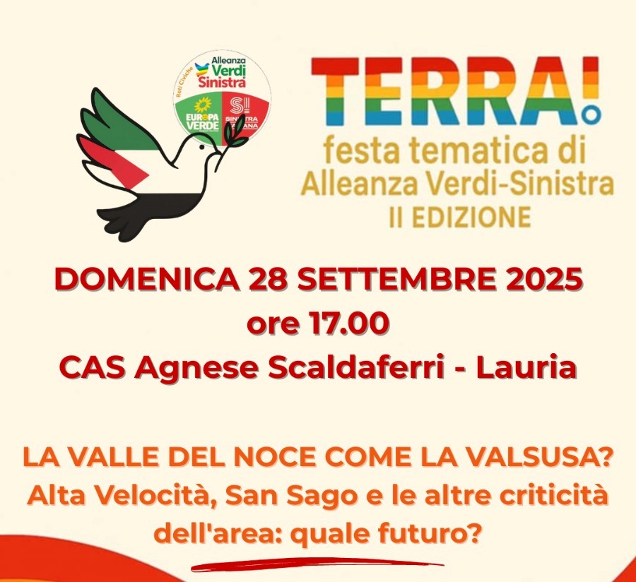 27/09/2025 | Lauria si prepara ad accogliere la seconda edizione di TERRA!, la festa tematica di Alleanza Verdi-Sinistra, che quest’anno mette al centro le sfide cruciali della Valle del Noce: Alta Velocità, discarica di San Sago e altre criticità che interrogano il futuro del territorio.