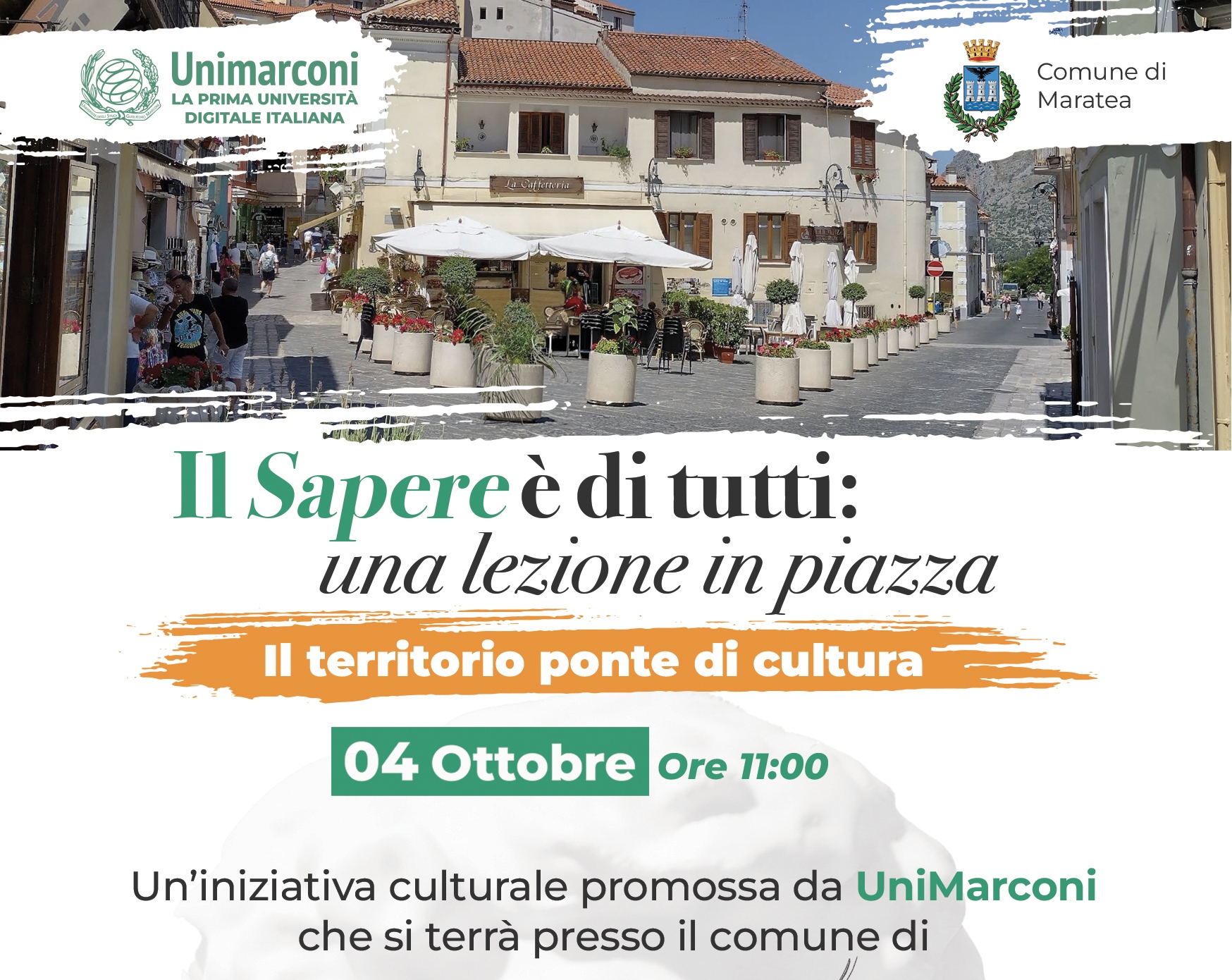 1/10/2025 | Il 4 ottobre Maratea sarà tra le protagoniste di “Il sapere è di tutti - Una lezione in piazza”, l’iniziativa culturale nazionale promossa dall’Università degli Studi "Guglielmo Marconi" di Roma che, in contemporanea, coinvolgerà oltre venti comuni italiani. Per un giorno, oltre venti città italiane saranno unite da un unico filo conduttore: rendere il sapere un bene condiviso, accessibile a chiunque. In contemporanea, i docenti dell’Università degli studi Guglielmo Marconi terranno lezioni pubbliche in presenza, trasformando le piazze in luoghi di dialogo, incontro e riflessione. A Maratea, l’appuntamento sarà affidato alla Prof.ssa Stefania Lirer, che proporrà un intervento dal titolo: “Il Territorio come Patrimonio Culturale: Conoscere, Valorizzare, Preservare”, un’occasione preziosa per vivere la cultura come parte integrante della vita cittadina. L’iniziativa promossa dall’Università degli Studi Guglielmo Marconi e sostenuta dal Comune di Maratea, nasce con l’intento di avvicinare il mondo accademico alle comunità locali, rendendo la cultura un patrimonio accessibile e condiviso. Maratea sarà capitale del sapere, parte di un progetto che unisce città e università in una grande lezione collettiva. L’appuntamento è fissato per il 4 Ottobre alle ore 11 in Piazza Buraglia (In caso di condizioni meteo avverse, la manifestazione si svolgerà nell’aula Mar@congress dell’I.I.S. Giovanni Paolo II di Maratea) Si darà avvio ai lavori con i saluti istituzionali a cura dell'Avv. Cesare Albanese Sindaco di Maratea, del Dott. Francesco Santoro Assessore alla Cultura e del Dott. Giuseppe Santo Gioia Componente del Consiglio Direttivo con Delega di Referente Territoriale per la Regione Basilicata Board Alumni Università degli Studi "Guglielmo Marconi" di Roma. Al termine della lezione, seguiranno gli interventi di altri rappresentanti istituzionali. Il pubblico presente potrà interagire e porre domande |