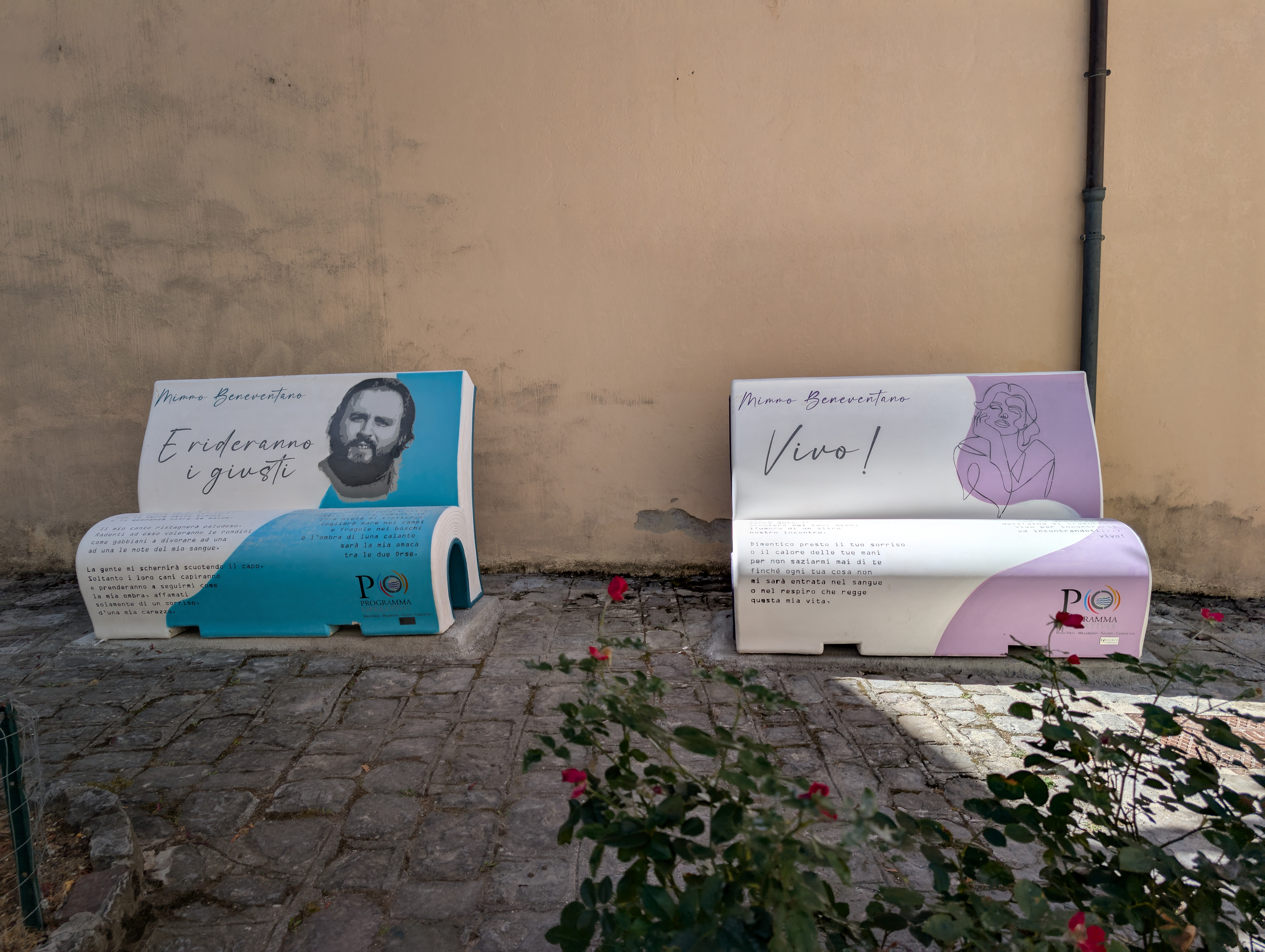 Le panchine non solo ospitano versi, ma si vestono di tinte che richiamano la bandiera della Pace un messaggio importante in questo momento storico, che trasforma la memoria in segno di convivenza, dialogo e speranza.