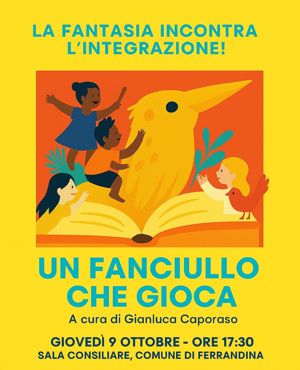 6/10/2025 | Sarà presentato giovedì 9 ottobre, alle ore 17.30, nella Sala Consiliare del Comune di Ferrandina, il libro "Un fanciullo che gioca", una preziosa testimonianza dei risultati di un laboratorio di scrittura fantastica tenutosi nell'estate del 2025.