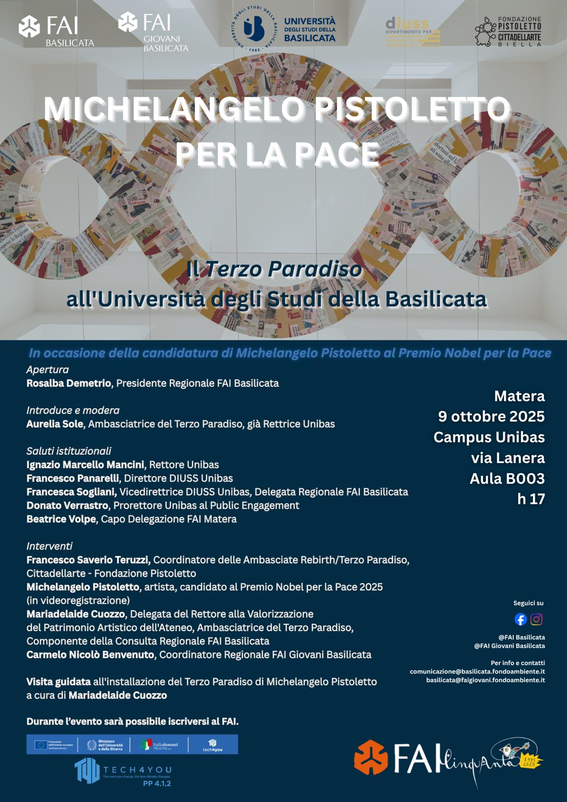 8/10/2025 | Giovedì 9 ottobre 2025 alle ore 17, presso il Campus di Matera dell'Università degli Studi della Basilicata, si svolgerà l'evento "Michelangelo Pistoletto per la Pace. Il Terzo Paradiso all'Università degli Studi della Basilicata", in occasione della candidatura al Premio Nobel per la Pace 2025 di Michelangelo Pistoletto, uno dei maggiori artisti viventi, protagonista di primo piano dell'arte contemporanea internazionale, insignito nel 2003 del Leone d'Oro alla Carriera della Biennale di Venezia, il quale nel 2019 ha fatto dono all'Ateneo lucano della sua opera "Terzo Paradiso" che è stata collocata in permanenza nel Campus di Matera. L'evento, promosso congiuntamente dall'Università della Basilicata e dal FAI Basilicata, si colloca in apertura delle Giornate d'Autunno del FAI, che celebra quest'anno il suo cinquantenario.