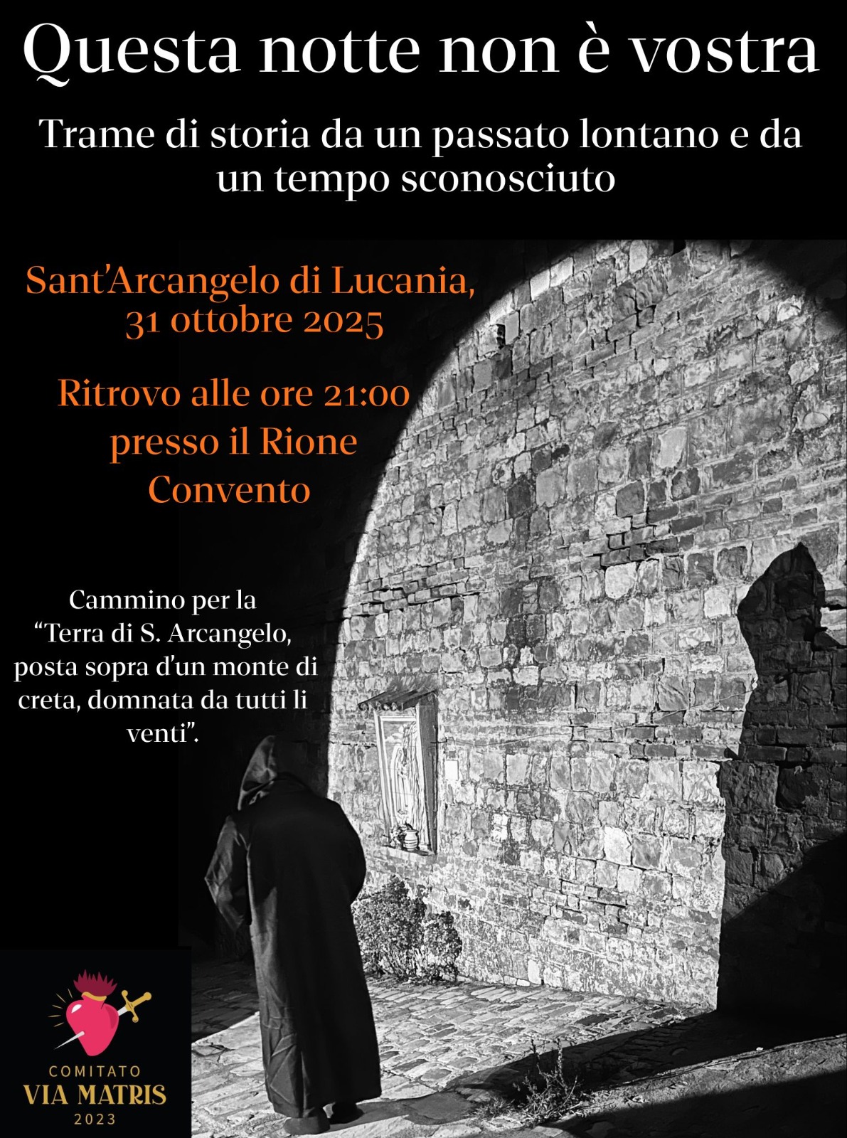 28/10/2025 | Venerdì 31 ottobre a Sant’Arcangelo si rivivrà un’antica processione locale, organizzata dall’associazione Via Matris, che rievocherà racconti storici discendenti dalle narrazioni popolari santarcangiolesi. Una serata, o per meglio dire nottata, all’insegna della riscoperta di antiche tradizioni tra le vie più suggestive del centro storico, in un’atmosfera surreale che coinvolgerà i partecipanti in un’esperienza unica e sbalorditiva.