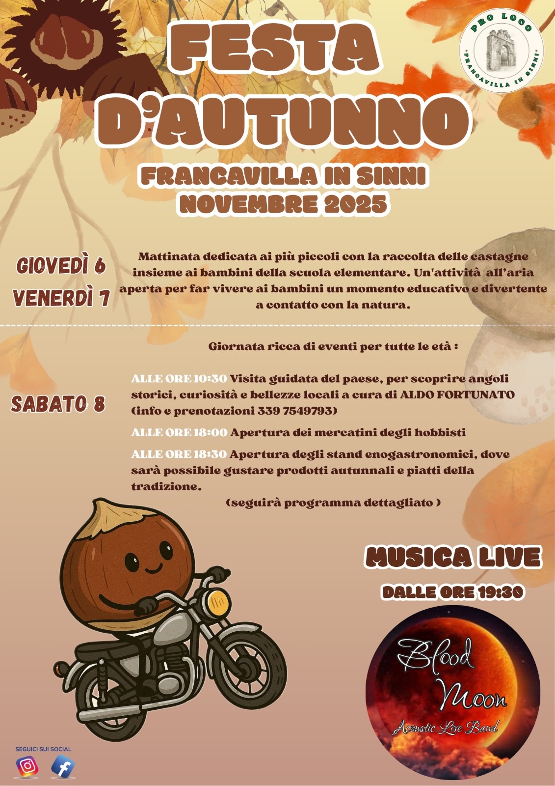3/11/2025 |   La Pro Loco di Francavilla in Sinni, recentemente rinnovata, presenta la Festa d’Autunno, in programma giovedì 6, venerdì 7 e sabato 8 novembre. Una tre giorni ricca di iniziative dedicate a tutte le età: il 6 e 7 novembre saranno giornate speciali per i più piccoli, con la raccolta delle castagne insieme ai bambini della scuola elementare, un’attività all’aria aperta che unisce divertimento ed educazione, a contatto con la natura. Sabato 8 novembre, a partire dalle ore 10:30, visita guidata del paese con Aldo Fortunato, per scoprire angoli storici e curiosità locali. Alle 18:00 apertura dei mercatini degli hobbisti e alle 18:30 degli stand enogastronomici con prodotti tipici autunnali. Dalle 19:30, musica live con il gruppo Blood Moon, per chiudere in allegria la giornata.