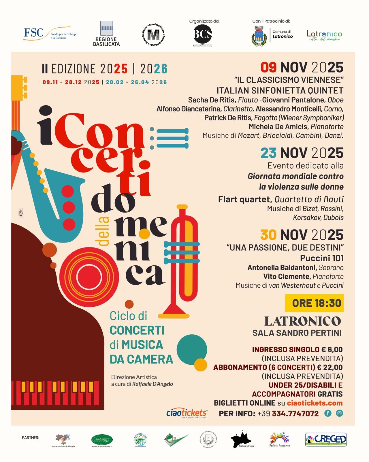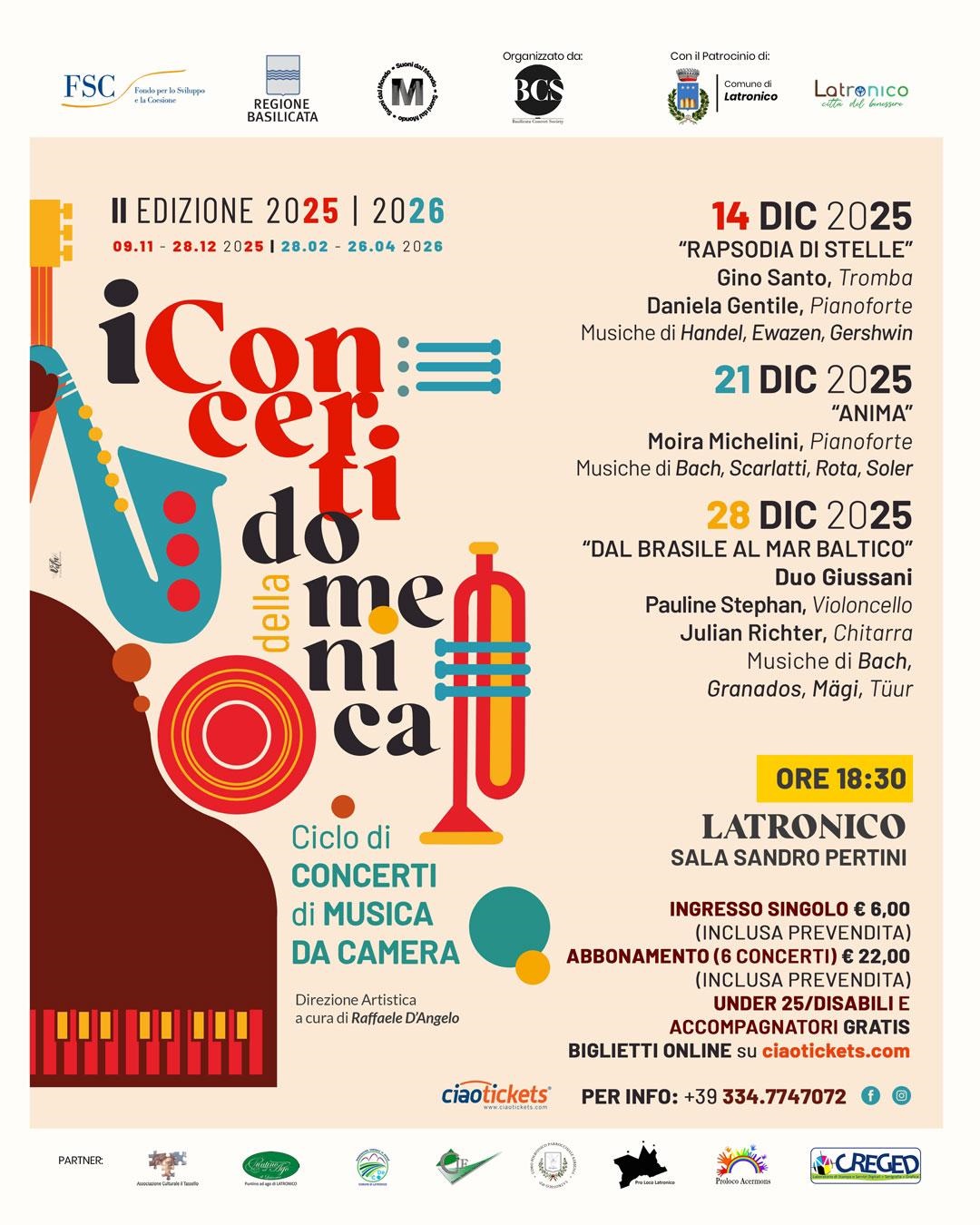 Un calendario variegato e di altissimo livello che conferma la rassegna “I Concerti della Domenica” come uno degli appuntamenti più attesi e amati della vita culturale di Latronico, capace di unire pubblico, artisti e territorio nella condivisione della grande musica dal vivo.