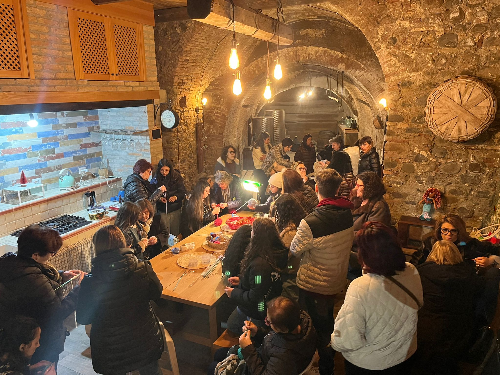 Il laboratorio si è svolto in un’antica cantina, scelta per il suo ambiente accogliente e familiare, capace di rievocare la calda atmosfera del vicinato e di rafforzare il senso di comunità. L’obiettivo principale era promuovere la condivisione e l’inclusione attraverso un’attività semplice, accessibile a tutti, che valorizzasse l’artigianato come patrimonio da tramandare di generazione in generazione, simbolo di autenticità e creatività.