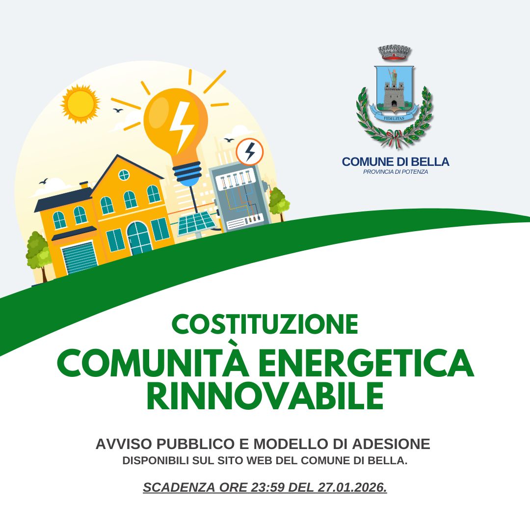 E’ stato pubblicato sul sito istituzionale del Comune di Bella (https://www.comune.bella.pz.it/it ) l'Avviso pubblico con il relativo modulo di adesione per la costituzione della CER (Comunità Energetica Rinnovabile) con scadenza fissata per le ore 23.59 del 27 gennaio 2026....-->continua |