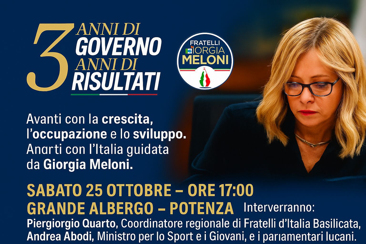 Domani, sabato 25 ottobre alle ore 17, presso il Grande Albergo di Potenza, Fratelli d’Italia Basilicata celebrerà i tre anni di governo Meloni con l’iniziativa “3 anni di governo, 3 anni di risultati”, un momento di confronto e partecipazione per ripercorrere...-->continua |