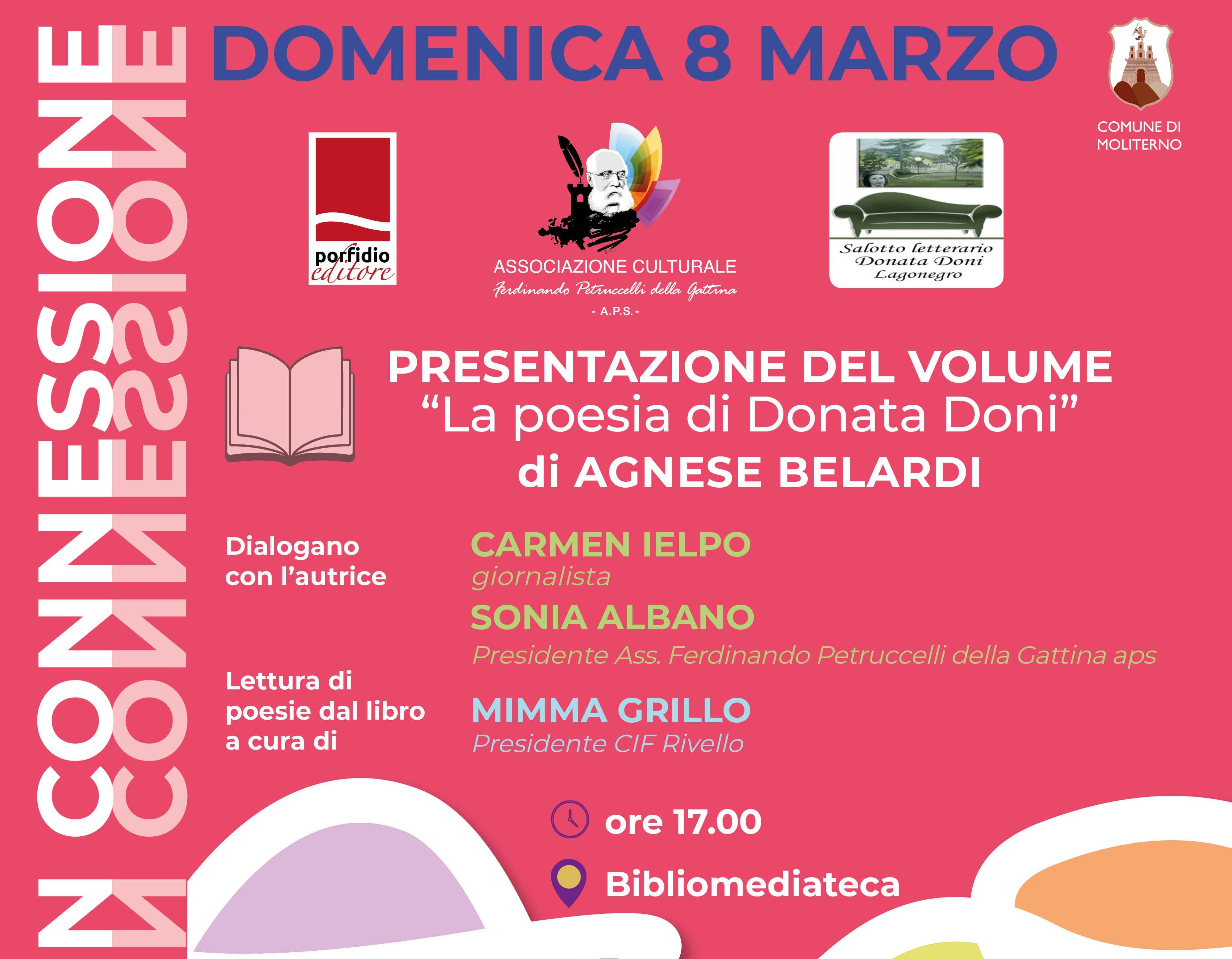 In occasione della Giornata Internazionale della Donna, la Biblioteca comunale di Moliterno ospiterà alle 17:30 la presentazione del volume “La poesia di Donata Doni” di Agnese Belardi, dedicato alla figura della poetessa Donata Doni. Il libro ricostruisce la vita e l’opera dell’autrice nata a Lagonegro nel 1913, riscoprendone la sensibilità lirica e il valore umano. Un ap...-->continua