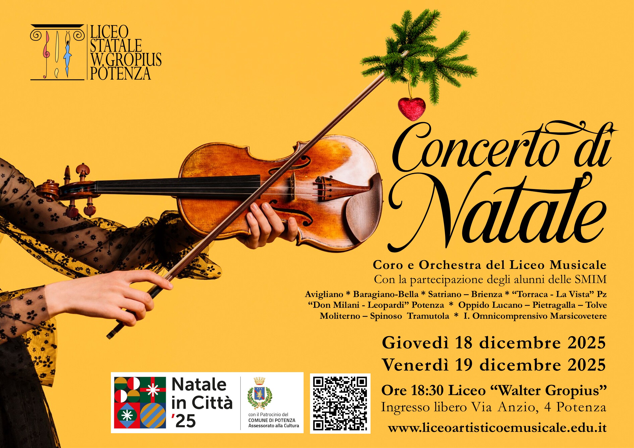 Il Liceo Musicale “Walter Gropius” di Potenza presenta il tradizionale Concerto di Natale che si terrà in due serate consecutive, giovedì 18 e venerdì 19 dicembre 2025, alle ore 18:30 presso la sede di Via Anzio, 4. L’ingresso è libero.