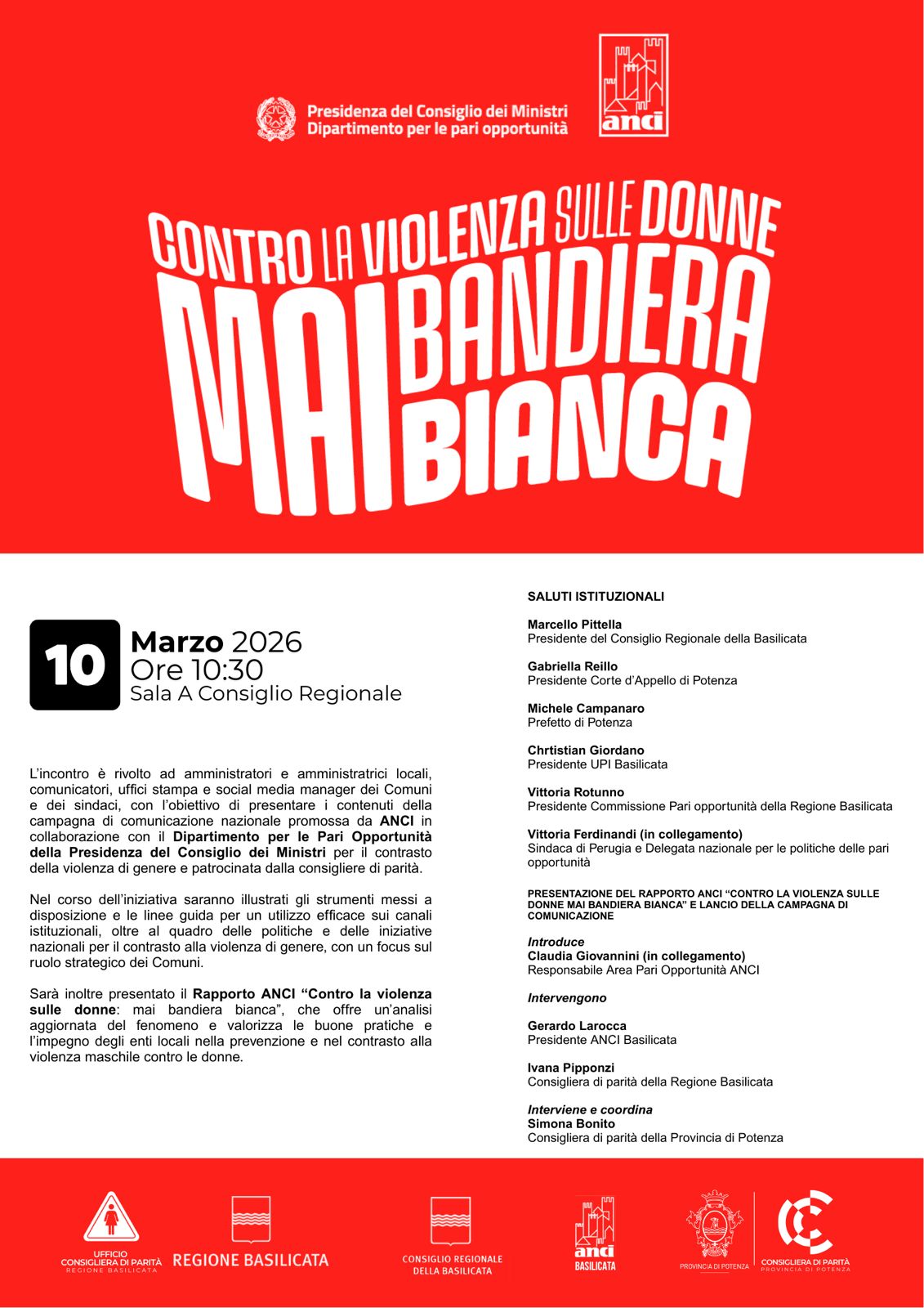 Il Consiglio regionale della Basilicata è convocato, in seduta ordinaria, martedì 10 marzo 2026 alle ore 15.00, nell’aula Dinardo, sita al piano terra del Palazzo della Giunta regionale, in via Verrastro n. 4.