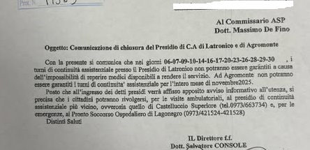 Dopo le chiusure improvvise dei giorni scorsi, questa mattina l’Azienda Sanitaria Provinciale ha comunicato ufficialmente che la guardia medica di Latronico resterà aperta a giorni alterni, mentre la sede di Agromonte rimarrà chiusa per l’intero mese di novembre.