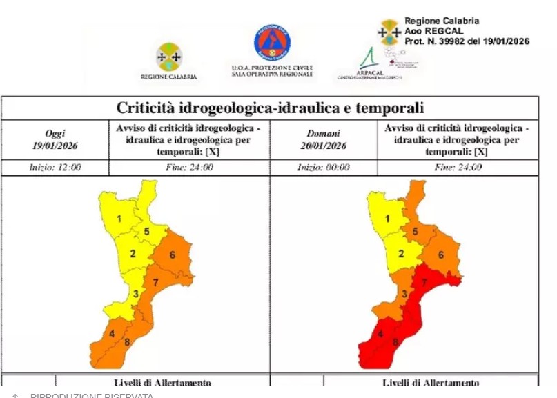 19/01/2026 - Innalzato livello d'allerta in Calabria, domani rosso su catanzarese e reggino