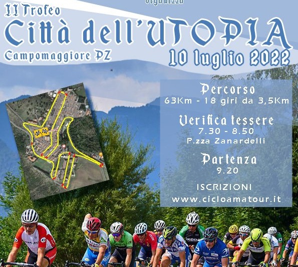 CAMPOMAGGIORE - È ormai in fase di avanzata organizzazione a Campomaggiore il Trofeo Città dell’Utopia curata in tandem dalla Motostaffette Potenza e dal sodalizio pugliese della Spes Alberobello. Le operazioni di ritrovo degli atleti, verifica licenze, e consegna numeri, sono programmate per domenica 10 luglio dalle 7:30 alle 8:50 in Piazza Zanardelli con partenza alle 9:20. La gara prevede la percorrenza di un circuito ondulato di 3,5 chilometri da ripetere 18 volte (17 giri agonistici più uno turistico) sul seguente tracciato: corso Umberto, via Spanocchi Quintilla, via Garibaldi, via Scotellaro, via Poveromo, via Gioacchino Cutinelli Rendina, via Generale Carlo Alberto Abbate, via Cavaliere Vincenzo De Marco, via Garibaldi, strada provinciale 13 di Castelmezzano sino all’incrocio con via Martiri del Lavoro, via Pagano e arrivo in corso Umberto I.
